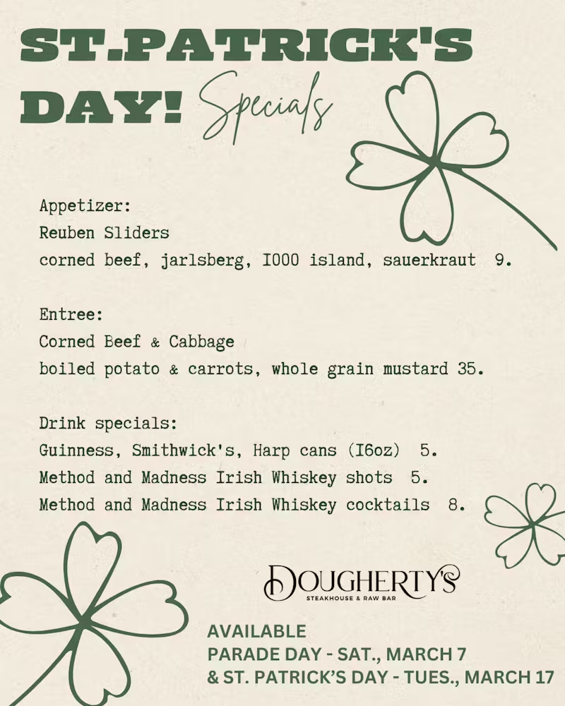 Celebrate St. Patrick’s Day at Dougherty’s with festive Irish favorites and drink specials! Enjoy Reuben sliders to start, classic corned beef & cabbage for your entrée, and sip on Guinness, Smithwick’s, Harp, or Method and Madness Irish Whiskey cocktails.