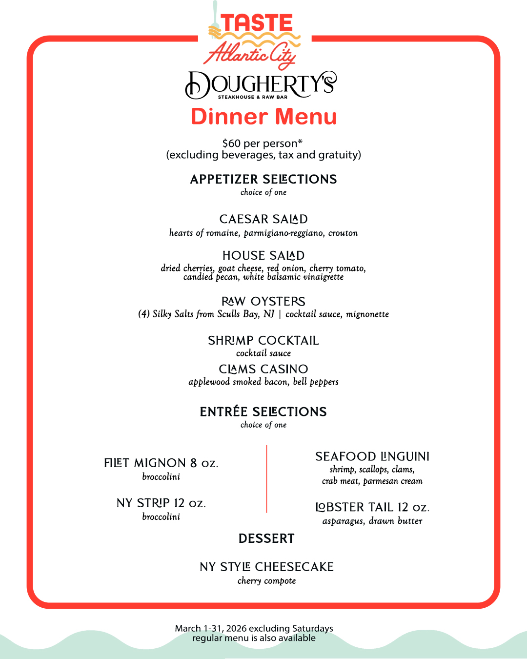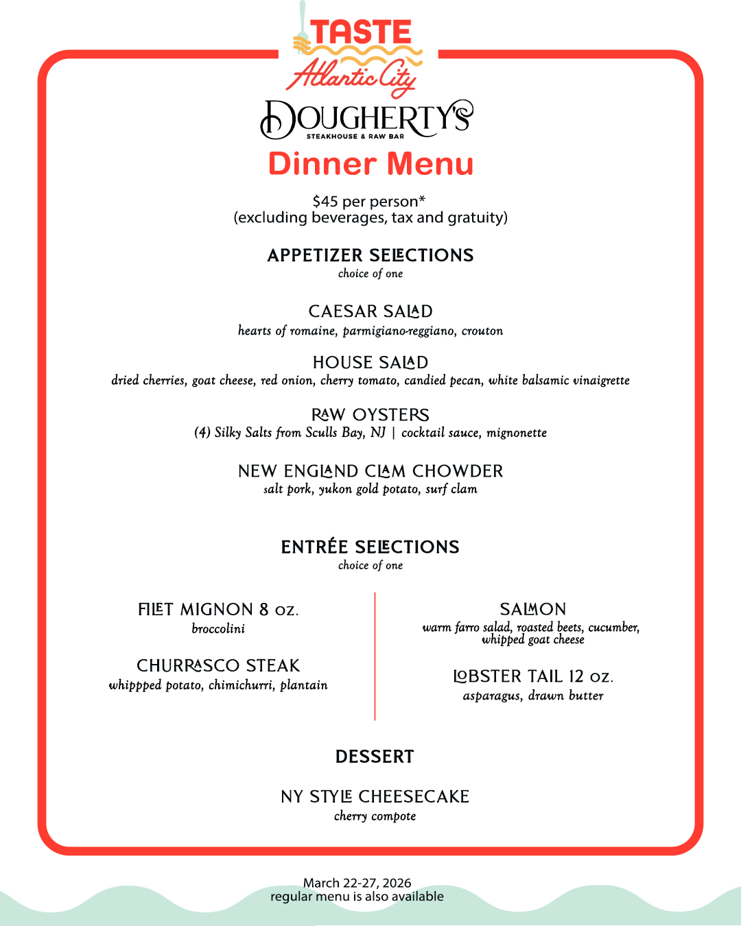 Dougherty’s Steakhouse & Raw Bar is proud to be part of Taste Atlantic City this March 2026 - a month-long culinary celebration showcasing the very best of the city’s vibrant dining scene.